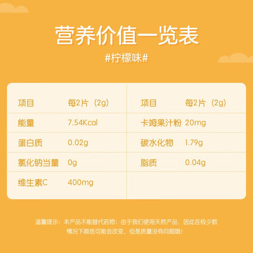 高含量维生素C片,含量高达400mg/片,全家人都可食用。清新的柠檬味,入口咀嚼口感酸甜。