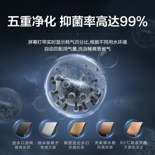 采用自主研发智慧芯片,水气比合理分配,温差控制在±0.5℃,沐浴不惧严寒。配有五重净滤,赋予您干净透彻的水源,呵护肌肤。