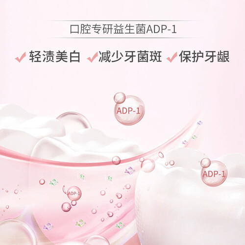 添加口腔专研成分益生菌ADP-1,瓦解牙齿牙菌斑,令牙齿更加洁白又健康;天然植物去渍素,去除顽固烟渍茶渍,抵御新色素。