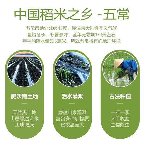 来自中国稻米之乡五常,肥沃黑土地种植,天然放心。蒸煮后饭粒油亮,粒粒香醇,爽弹飘香有嚼劲,劲道回甘。