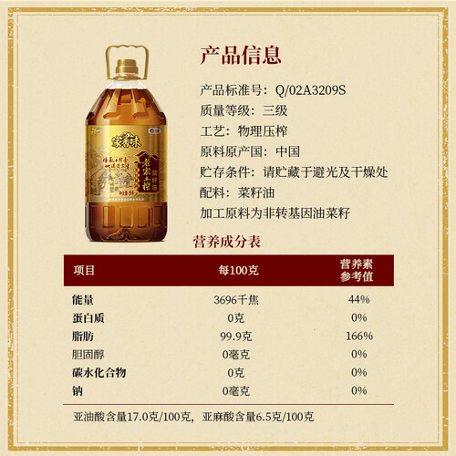 甄选非转基因油菜籽为原料,品质健康安全,放心烹饪各类食材。含有亚油酸、亚麻酸、维生素E等营养,满足健康膳食所需。