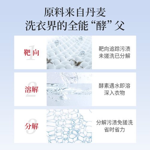 多层次的香味,犹如喷洒了香水一般,让你享受时刻被香气围绕的感觉。丹麦复合酵素,轻松去除多种顽固污渍,每天都穿新衣物。