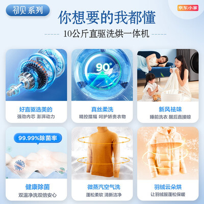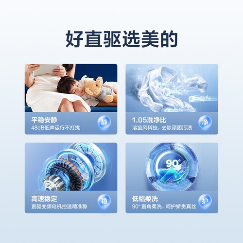 搭载DD直驱电机,洗衣时产生的噪音更低。智慧手洗功能让滚筒小幅度转动,呵护衣物。筒自洁功能,能高温消除筒内细菌,保护家人健康。