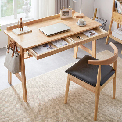 多功能储物实木书桌,优质进口橡胶木纹理清晰,边角圆润打磨不易碰伤,搭配上实木挂钩的设计,可以挂上耳机或书包等物件。