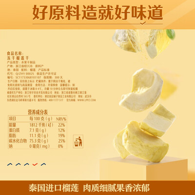 良品铺子榴莲干以泰国进口榴莲为原料,由独特创新技术处理,口感酥脆,健康营养,味道浓郁,轻咬一口,香味充盈唇齿间。