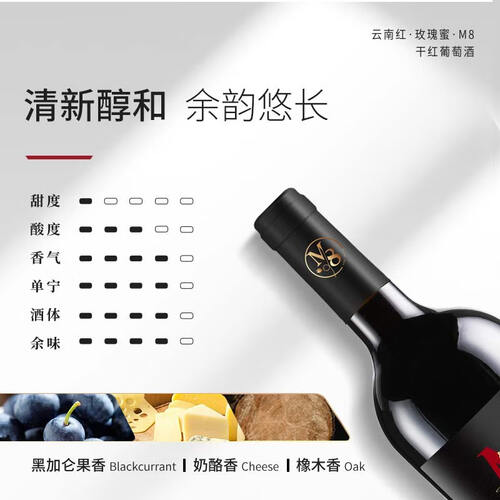 精选品质优良的老藤葡萄,带来更加浓郁纯正的果香,精细酿造。酒水带有明显的黑色水果香气,清爽细腻。