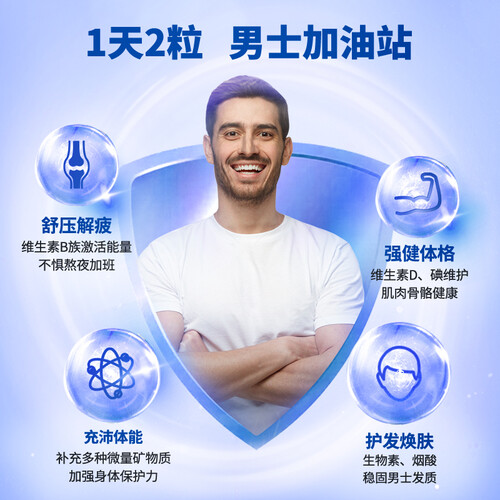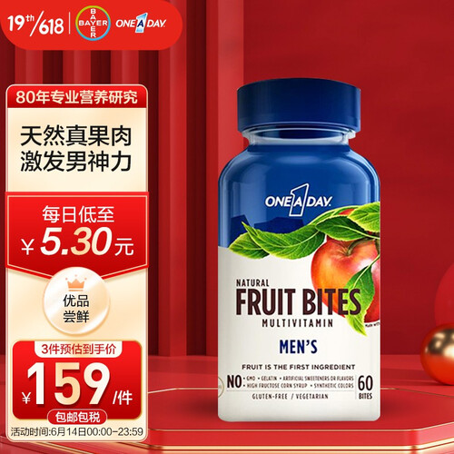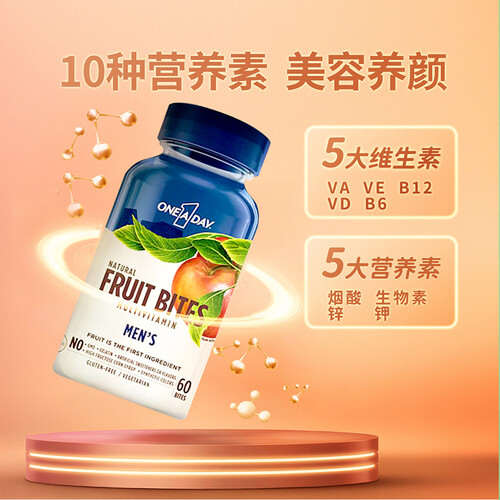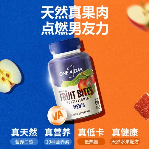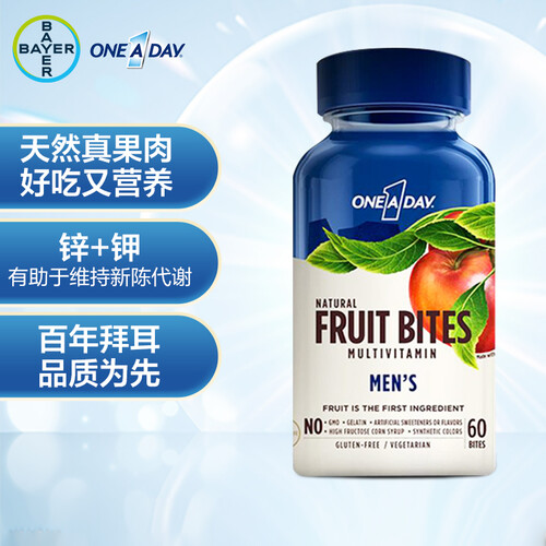 拜耳出品,富含维生素、锌、生物素、钾等成分,促进身体新陈代谢,辅助缓解身体疲劳,真实水果颗粒,每天1片,释放男性新活力。