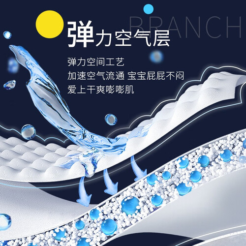 拥有弹力空气层,帮助促进气流的循环流动,让臀部不会闷热难耐。一片能吸收六次尿量,兜得更多锁得更牢,是宝妈们的品质之选。