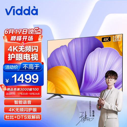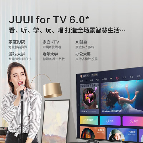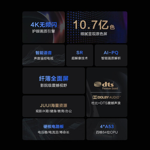 4K无频闪护眼;智慧语音,免遥控;轻松愉快看电视享受生活,智能投屏;野更沉浸;声音立体环绕。
