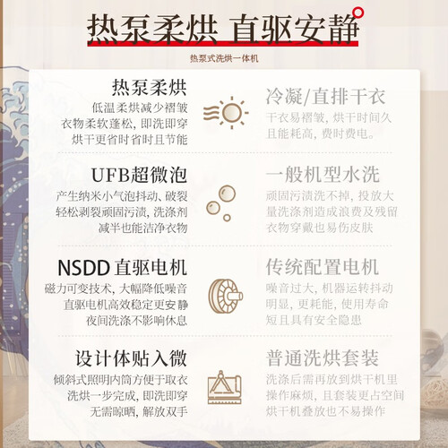 采用超微泡技术,能有效深入衣物纤维,去除顽固污渍。搭载热泵式干衣系统,大大缩短干衣的时间,阴雨天也能够快速干衣。