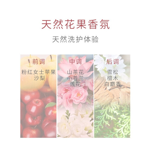 蕴含护肤级山茶油,天然滋养,令发芯健康强韧,发丝莹润柔亮,拯救脆弱损伤发丝;天然花果香氛,使用倍感愉悦。