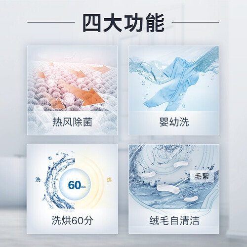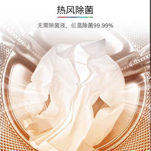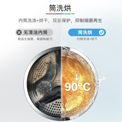 配备的热风除菌功能,无需添加除菌液,轻松穿透织物,快速杀菌,呵护家人的肌肤健康。90℃高温筒清洁,洁净卫生。