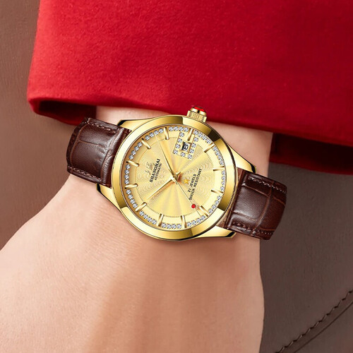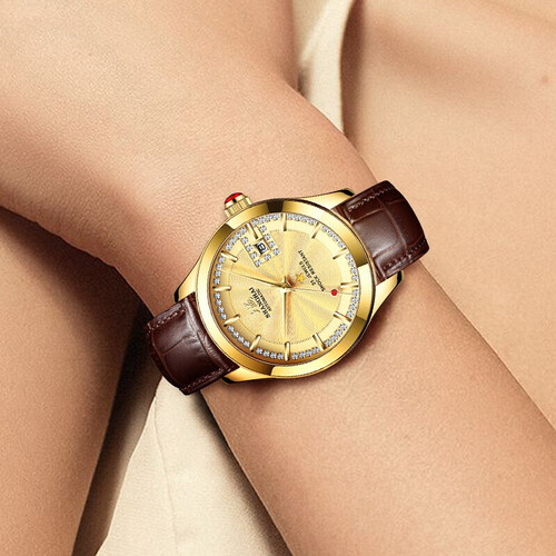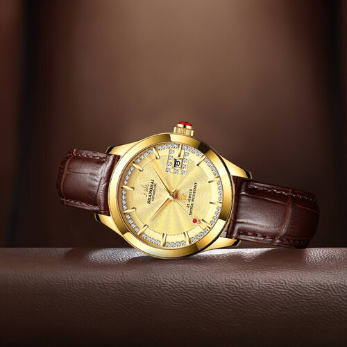 表带优选精钢材质打造,坚固耐磨,生活摩擦没有断裂丢失现象。表盘整体融入金色元素,设计感十足,成为腕上焦点。