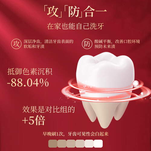 含有谷白皮、植酸钠等成分,轻松分解去除牙渍、牙垢,预防牙渍形成,焕发牙齿光泽度,无惧露齿,职场社交更自信。