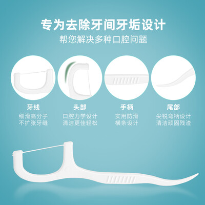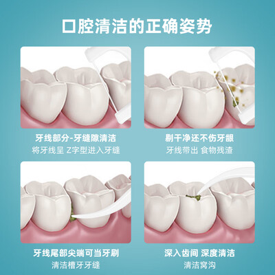 符合口腔力学设计,牙线头光滑圆润,清洁不伤口腔。细滑牙线,轻松深入牙缝,剔除食物残渣,洁净无垢无异味。