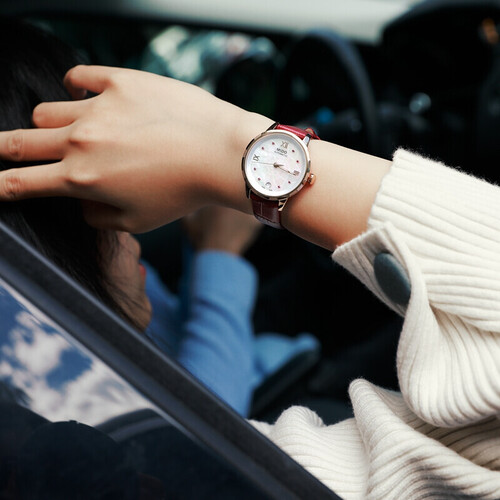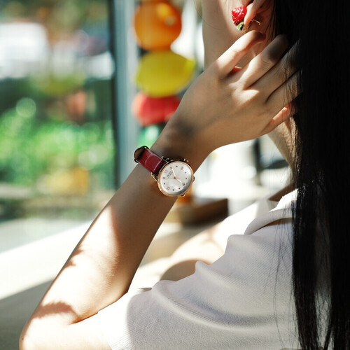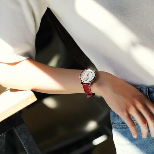 红色表带,衬托肌肤白皙,佩戴优雅而又出众。表盘中间以一朵盛开莲花进行点缀,魅力尽显。30米的防水等级,可以戴着手表洗手。