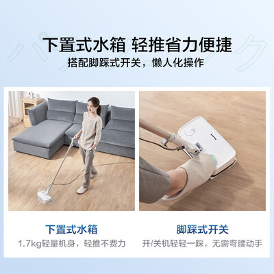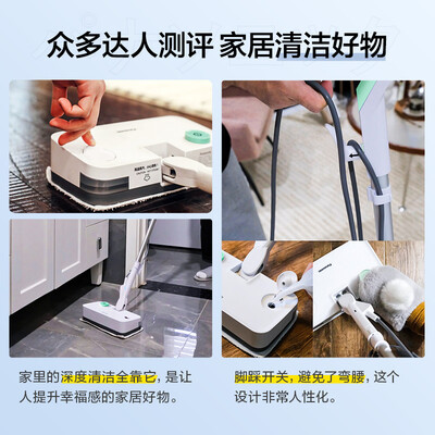 高温蒸汽拖地,除菌除螨,呵护家庭健康。搭配强效去污拖布,轻松拖地,一拖即净。脚踏式开关,轻松脚踩开机关机,免弯腰不费力。
