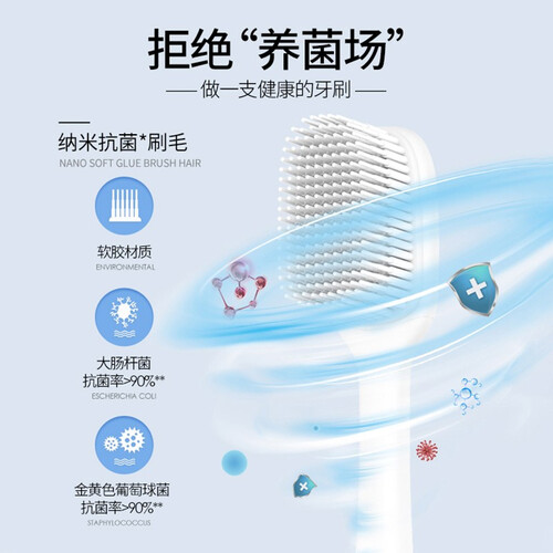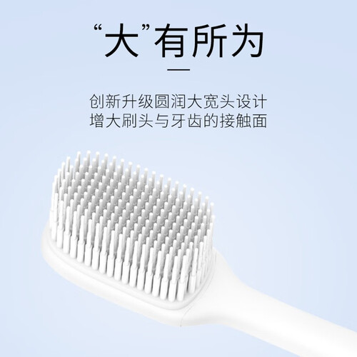 刷毛具有细腻柔软的体验,结合刷头刷毛一体设计,卫生洁净。此外,宽刷头的设计,刷牙更快速,进行大面积清洁。