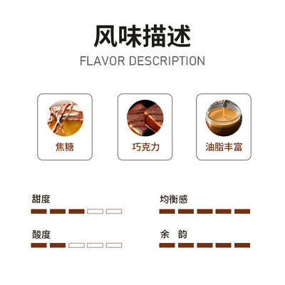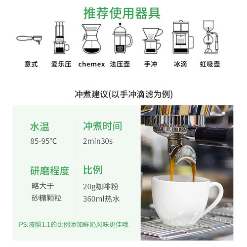 咖啡豆采用新鲜烘焙的方式,保留了新鲜的口感;冲泡后咖啡拥有丰厚的油脂,使其更加浓郁。