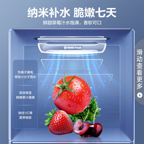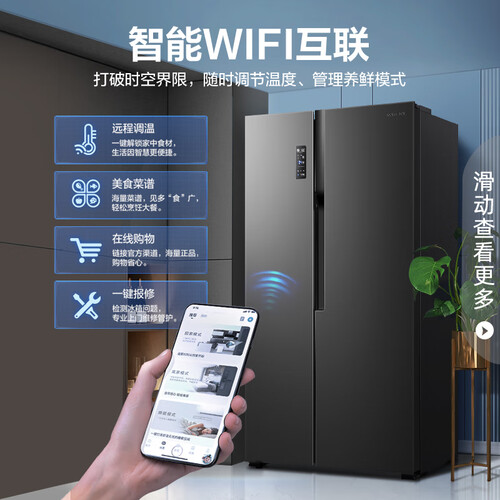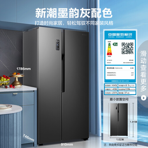 内设645升大容量,一次能够储存全家两周的食材。机身设计典雅有品位,面板采用墨韵灰面板,耐磨损易清洁。