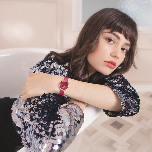 酒红的配色,优雅大气,圆盘皮带的款式,简约百搭,永不过时。