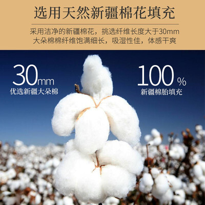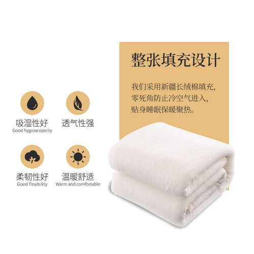 甄选新疆好棉花,质地蓬松保暖性好,吸湿性佳,盖在身上干爽不潮湿。采用的是整张棉花填充,经久耐用,不易断裂。