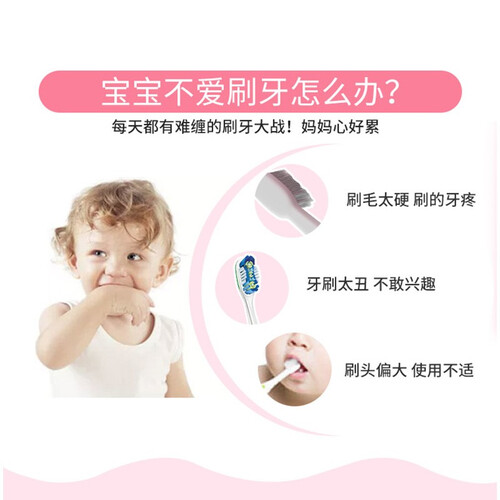 小巧的刷头很适合小宝宝较小的口腔,能够灵活的多方位清洁,超柔软紧密的刷毛,能够贴合齿面按摩牙龈。