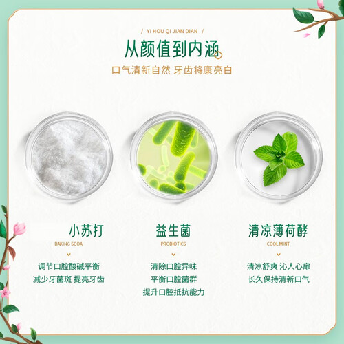 小苏打成分可以帮助平衡口腔中酸碱度,防止腐蚀牙齿,减少蛀牙的产生。添加益生菌,帮助平衡口腔菌群,提升口腔自身抵抗力。