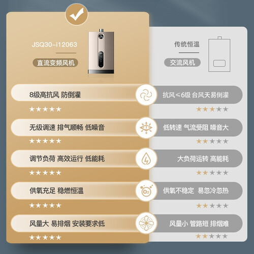 搭载可实时监控风压变化的变频风机,提升热水器燃烧稳定性。三挡变升,满足不同季节和不同场景下的恒温用水需求。