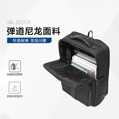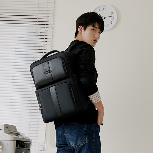 高密度弹道尼龙拼贴高品牛皮革面料,精致耐磨,彰显专业高端商务背包的高级感;专业商务分仓,满足通勤、出差、谈判等收纳需要。