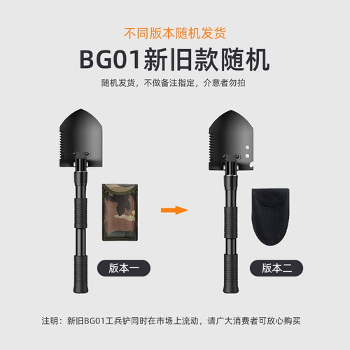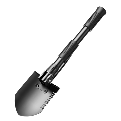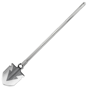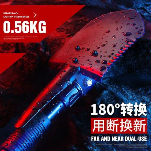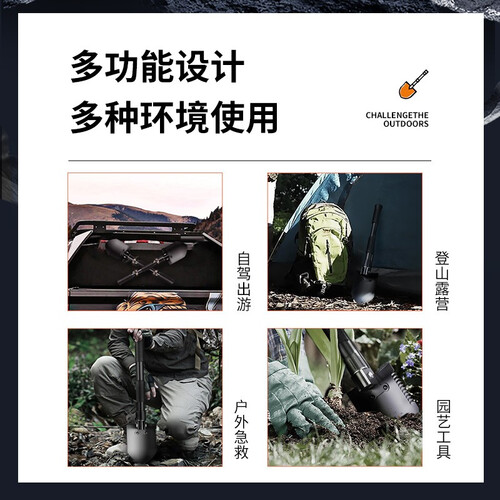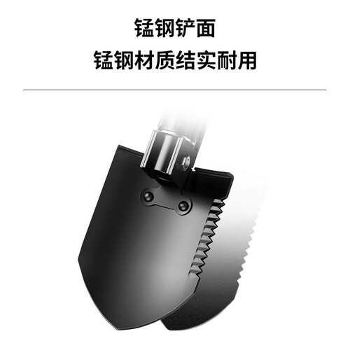 锰钢材质铲面,经过精细打磨后,质地耐磨损抗刮花,使用寿命持久。多功能尖镐设计,可切换为多种求生工具。