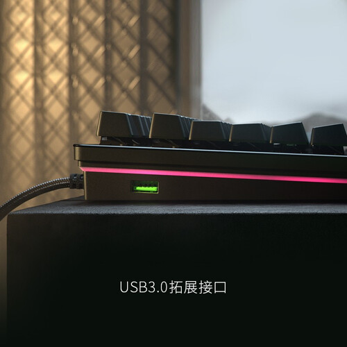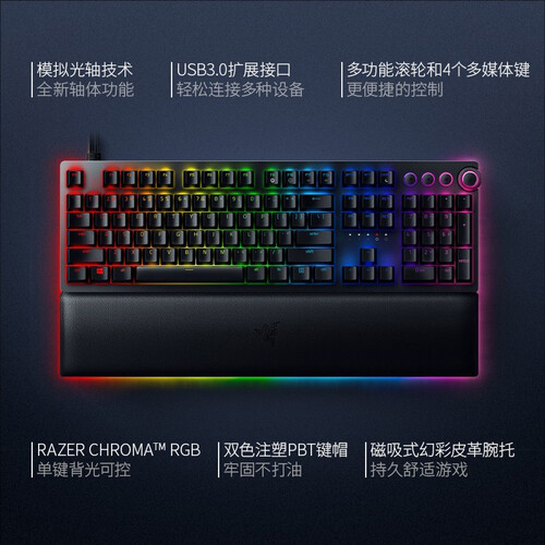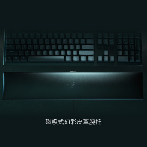 键盘采用磁吸式幻彩皮革腕托,不仅展现绚丽灯效,更有效减轻手腕负担。并配备多功能数字旋钮和4个多媒体按键,操控方便。