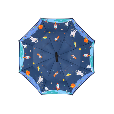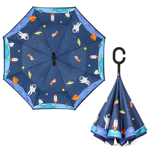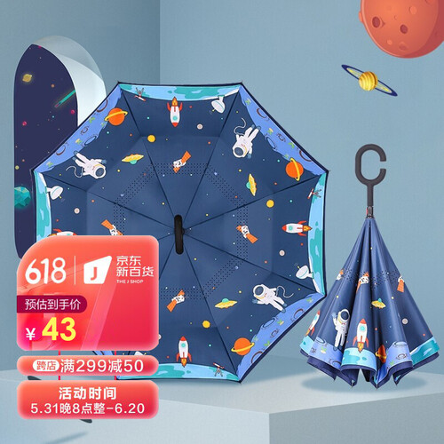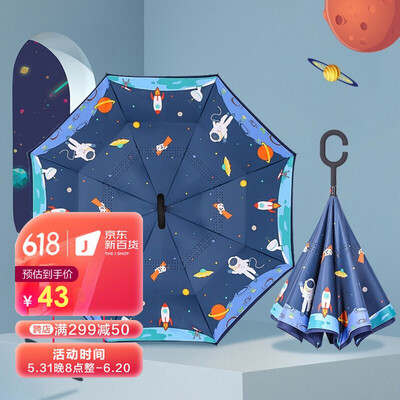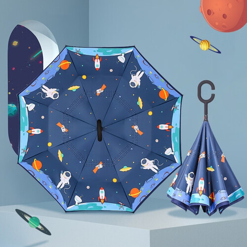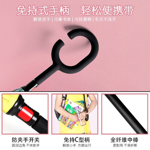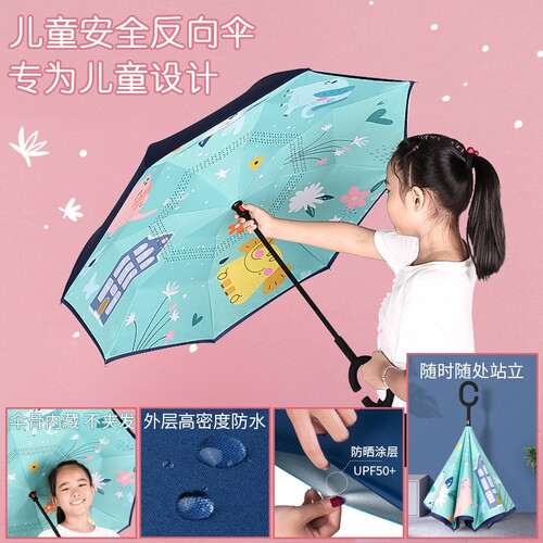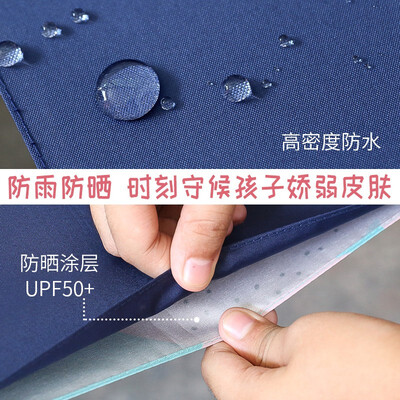 外层伞布,高密度防水碰击布,内层伞布,防晒紫外线upf50+,遇到强风不翻伞透气更清爽,伞骨内藏避免宝宝头发夹在伞骨上。