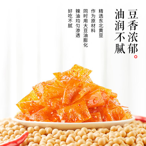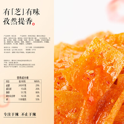精选东北黄豆作为原材料和新疆优质芝麻,吐鲁番自然四川辣椒等上乘食材,口感麻香好吃不腻,耐咀嚼,吮指不停。