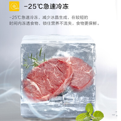 冰箱内设计了零冻锁鲜舱,可以用于存储保质期短的肉类,免除了解冻麻烦,同时还可保持肉类的鲜润好口感。