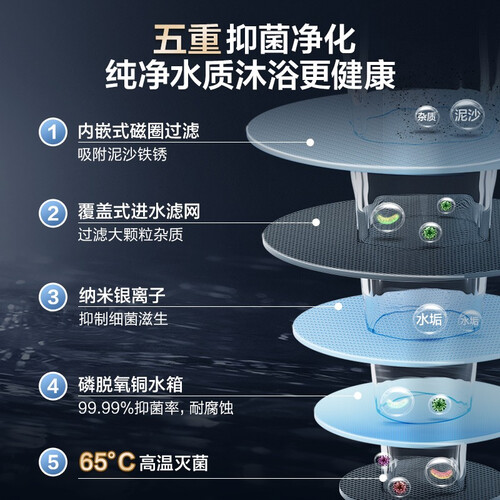 升级银离子抑菌,实现层层净化水质,保护娇嫩肌肤。智能遥控功能,带来多种智能交互新体验,还可实时掌握热水器状态。