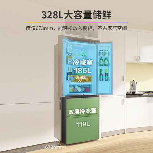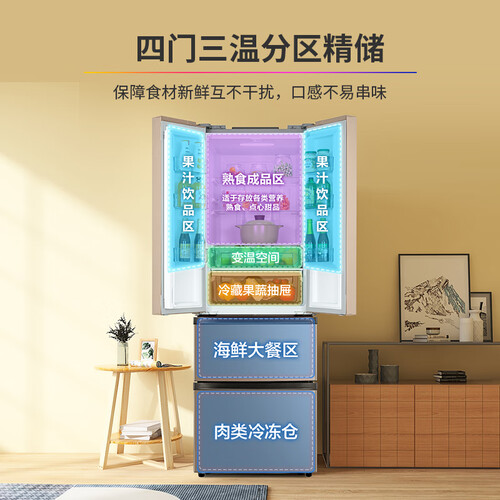 大容量的存储空间,满足更多食材养鲜,囤货无烦恼。四门三温分区的设计,精储不同食材,防止食材串味。