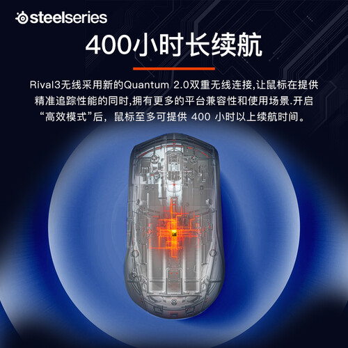 赛睿这款无线鼠标能够提供高达400小时以上的游戏续航时间,满足玩家数月的使用需求,不用为电量担心。