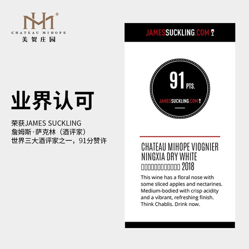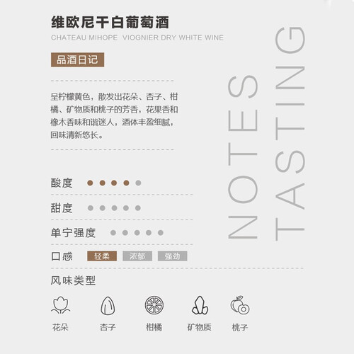 酒体呈柠檬黄色,香气浓郁,伴随花朵杏子柑橘等香气,入口柔顺饱满,单宁成熟细腻,回味余香充盈。