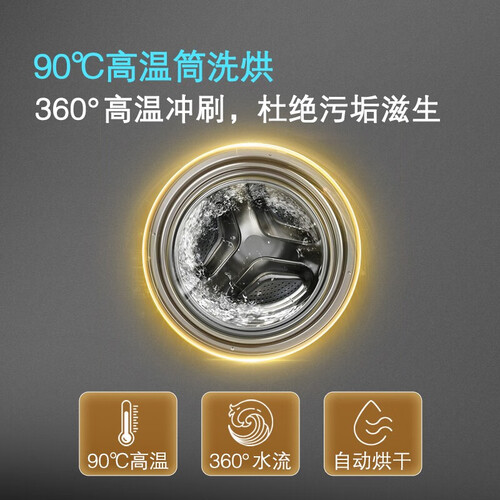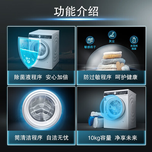 这款洗衣机的容量为10KG,可以轻松洗涤大件衣物,使用更省心。搭配高温自清洁技术,去除细菌污垢,洗衣环境清新干净。