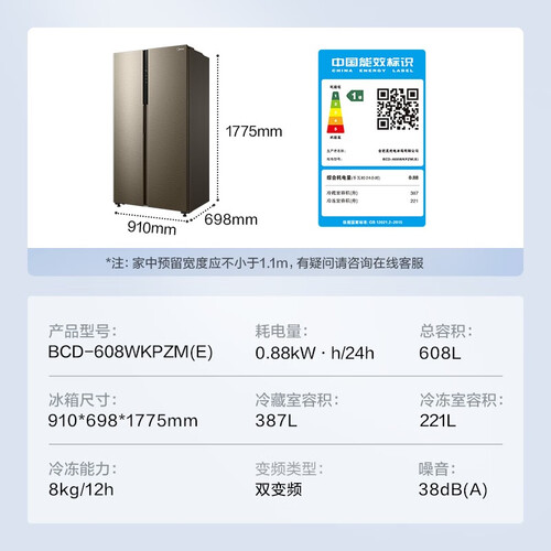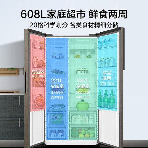 608L大容量,超大容量满足全家美食存储需求,食材分门别类精细分储。变频一级能效,按需送冷,运行低耗节能,省电环保。