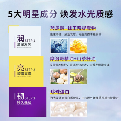 添加玻尿酸+蜂王浆提取物等5大明星成分,迅速渗透滋养发芯,焕发水光质感,补充发质营养,改善毛躁,令秀发顺滑有光泽。