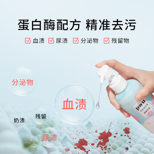 专为贴身衣物设计,科学配比的有效成分,可准确锁定污渍,快速净衣。按压泵头设计,取用方便,一瓶可使用120次。