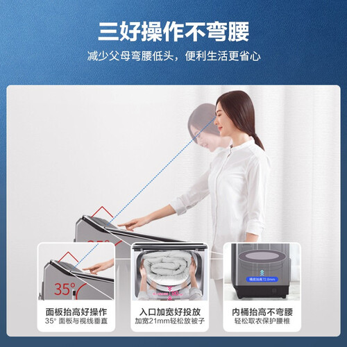 倾斜的版面设计符合人体力学,让你无需弯腰低头,即可轻松洗衣。全程智能水位,可根据桶内情况智能调节,自动洗衣。
