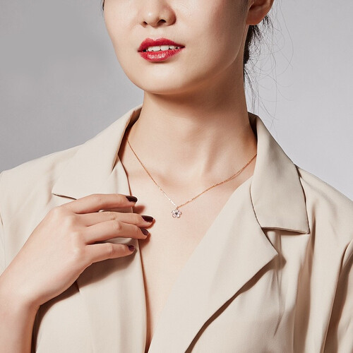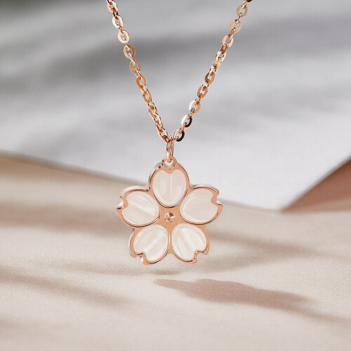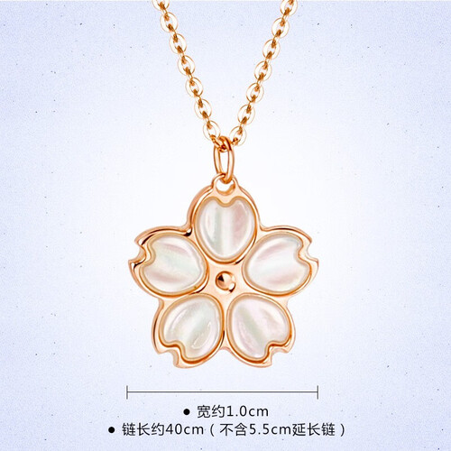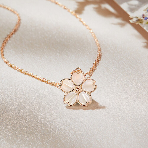 采用了樱花的造型设计,简约美观,佩戴后能够彰显人的优雅大气。同时每一片樱花花瓣都镶嵌了母贝贝壳,晶莹剔透有光泽。