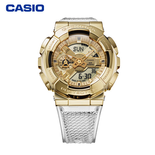 施加金色IP涂层的金属表壳,搭配透明表带,佩戴时更吸睛。纯粹的金色圆形大表盘设计,彰显出大气坚韧的新潮风格。