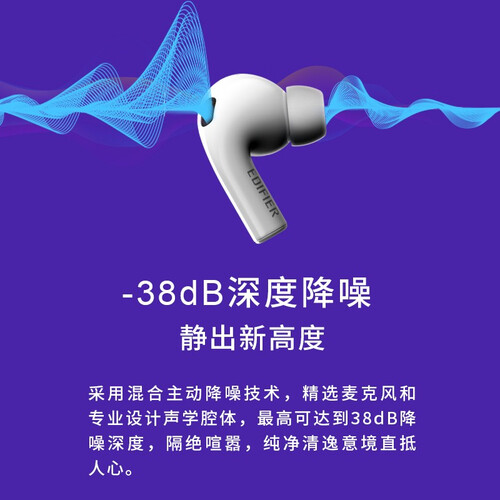 采用混合主动降噪技术,具有高达38分贝的降噪深度,打造更纯净的聆听氛围,具有环境音模式,清晰感知周围环境,保障安全。
