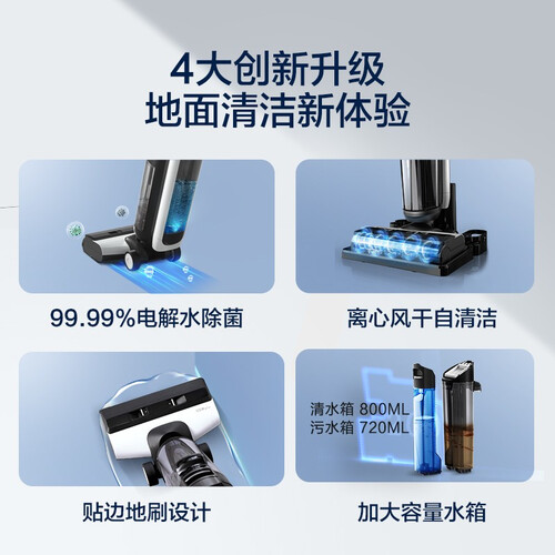 搭载电解水除菌模块,只需清洁一遍,地面便可洁净无菌。采用常温离心风干,不易将细菌扩散到空气中。创新贴边地刷,边边角角都能吸附。