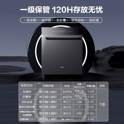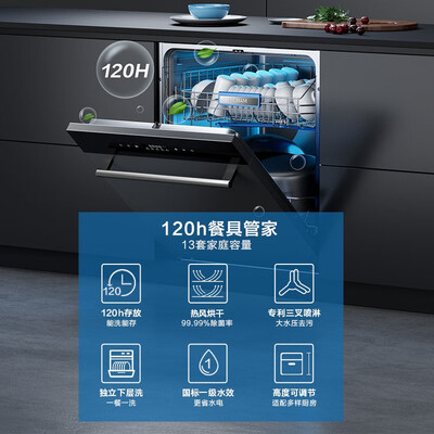120h超长换气存储,洗消烘存一体,真正实现餐具管家。采用喷淋式洗涤,清洁餐具没有盲区,顽固污渍也能快速清洗干净。