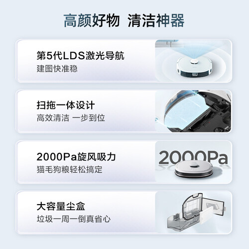 强达2000pa的集尘能力,配合加长软绒滚刷以及两边刷,增强清洁力。电动水泵恒压控制,扫拖一体完成地板清洁。